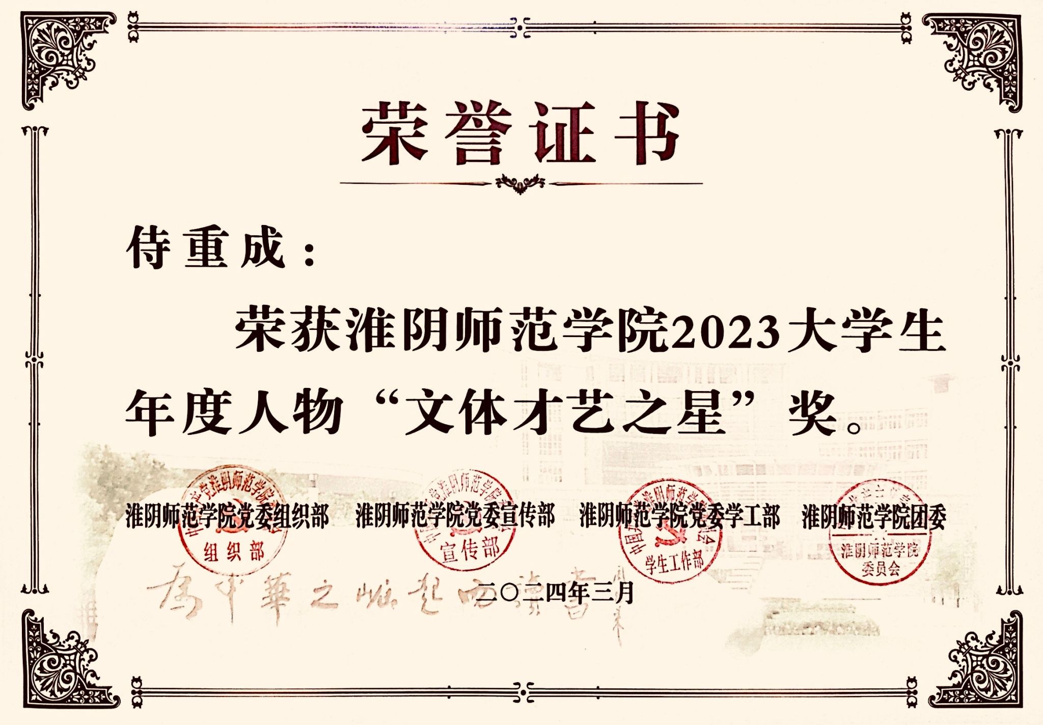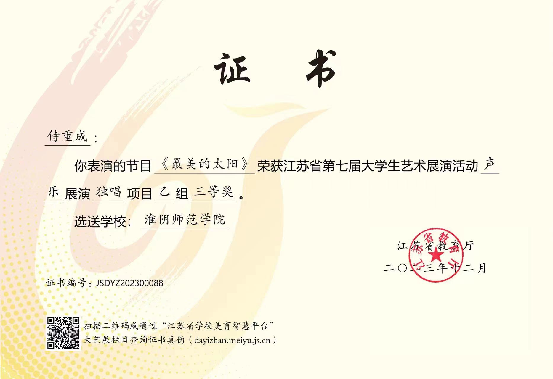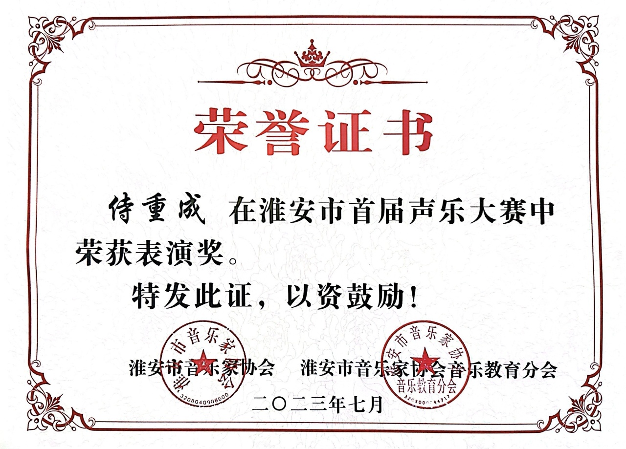 侍重成,男,汉族,共青团员,现任2205班班长,资助负责人,必一运动2024年度人物—文体才艺之星获得者,连续三次获得校一等奖学金,曾获校三好员工,校优秀共青团员,主题教育月先进个人等多项荣誉,连续参加2022、2023年两届江苏省流行音乐大赛“新莺奖”并斩获金奖,2023年代表必一运动参加江苏省老员工第七届艺术展演乙组(独唱)并荣获三等奖,曾参加淮安市集体老员工开学典礼,淮安市集体老员工毕业典礼等多项志愿活动,志愿时长长达300小时,校级及以上荣誉共计三十余项。