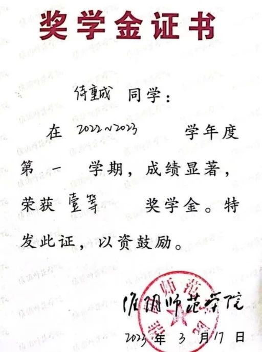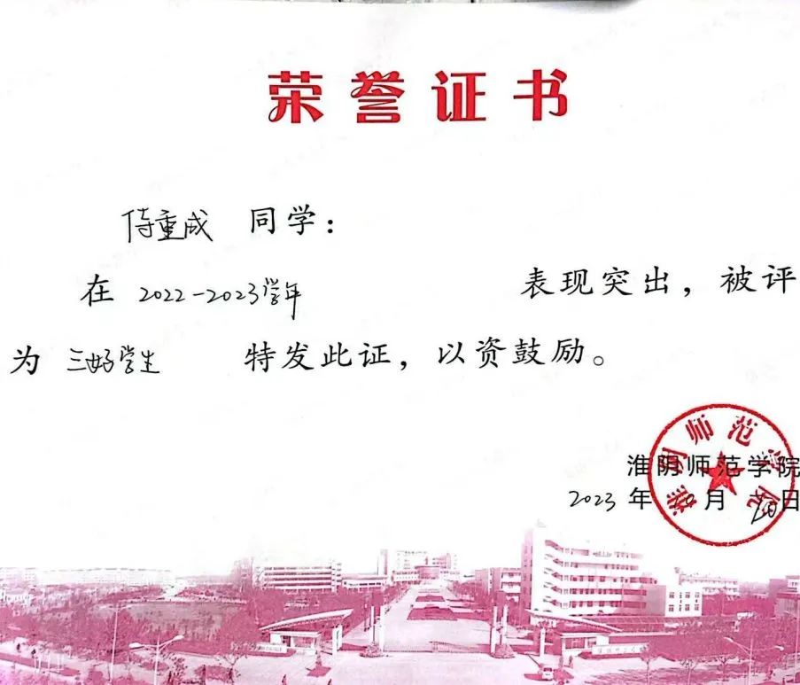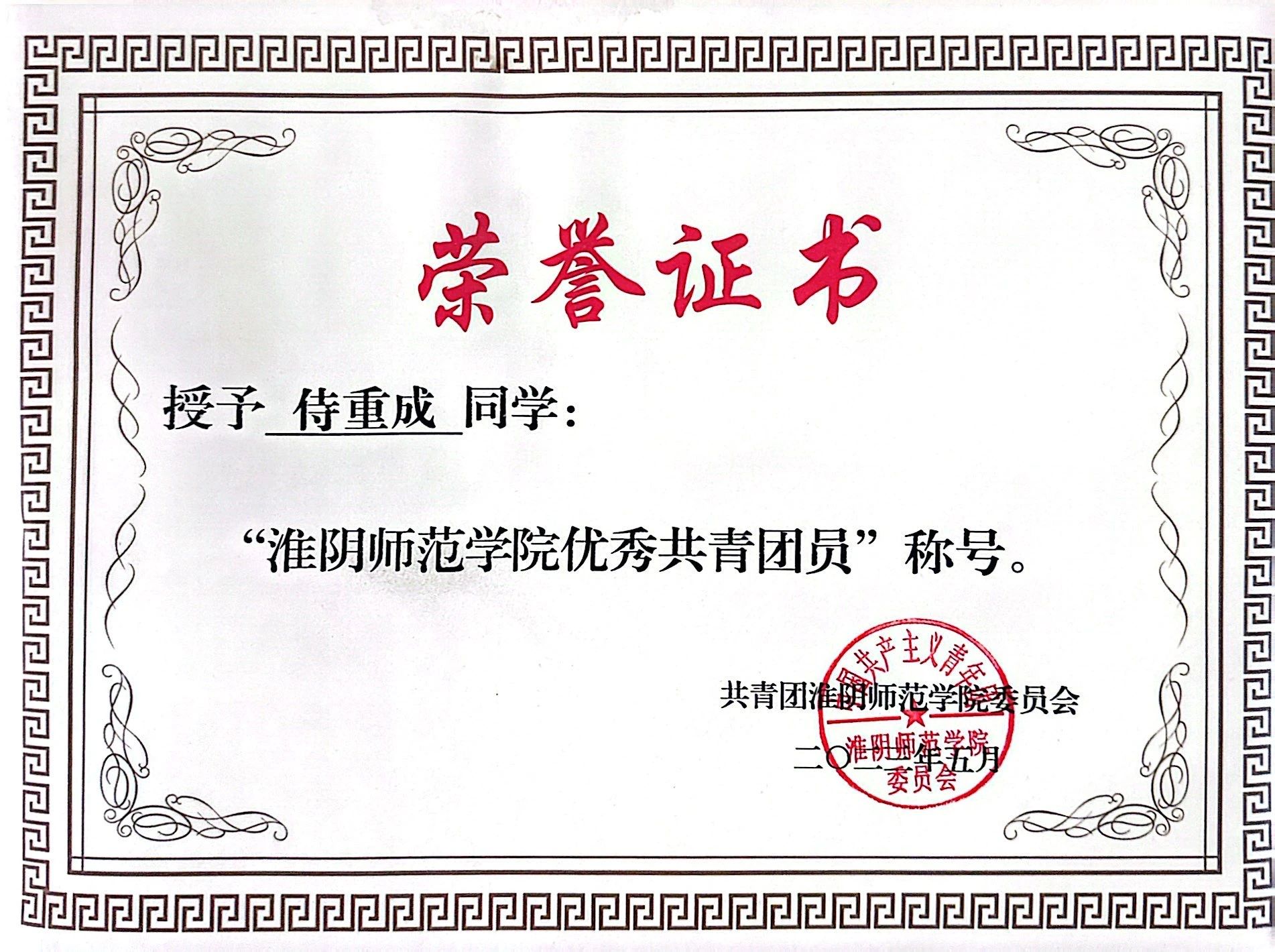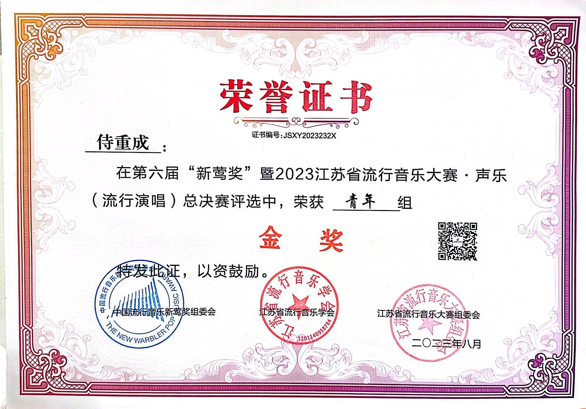 侍重成,男,汉族,共青团员,现任2205班班长,资助负责人,必一运动2024年度人物—文体才艺之星获得者,连续三次获得校一等奖学金,曾获校三好员工,校优秀共青团员,主题教育月先进个人等多项荣誉,连续参加2022、2023年两届江苏省流行音乐大赛“新莺奖”并斩获金奖,2023年代表必一运动参加江苏省老员工第七届艺术展演乙组(独唱)并荣获三等奖,曾参加淮安市集体老员工开学典礼,淮安市集体老员工毕业典礼等多项志愿活动,志愿时长长达300小时,校级及以上荣誉共计三十余项。