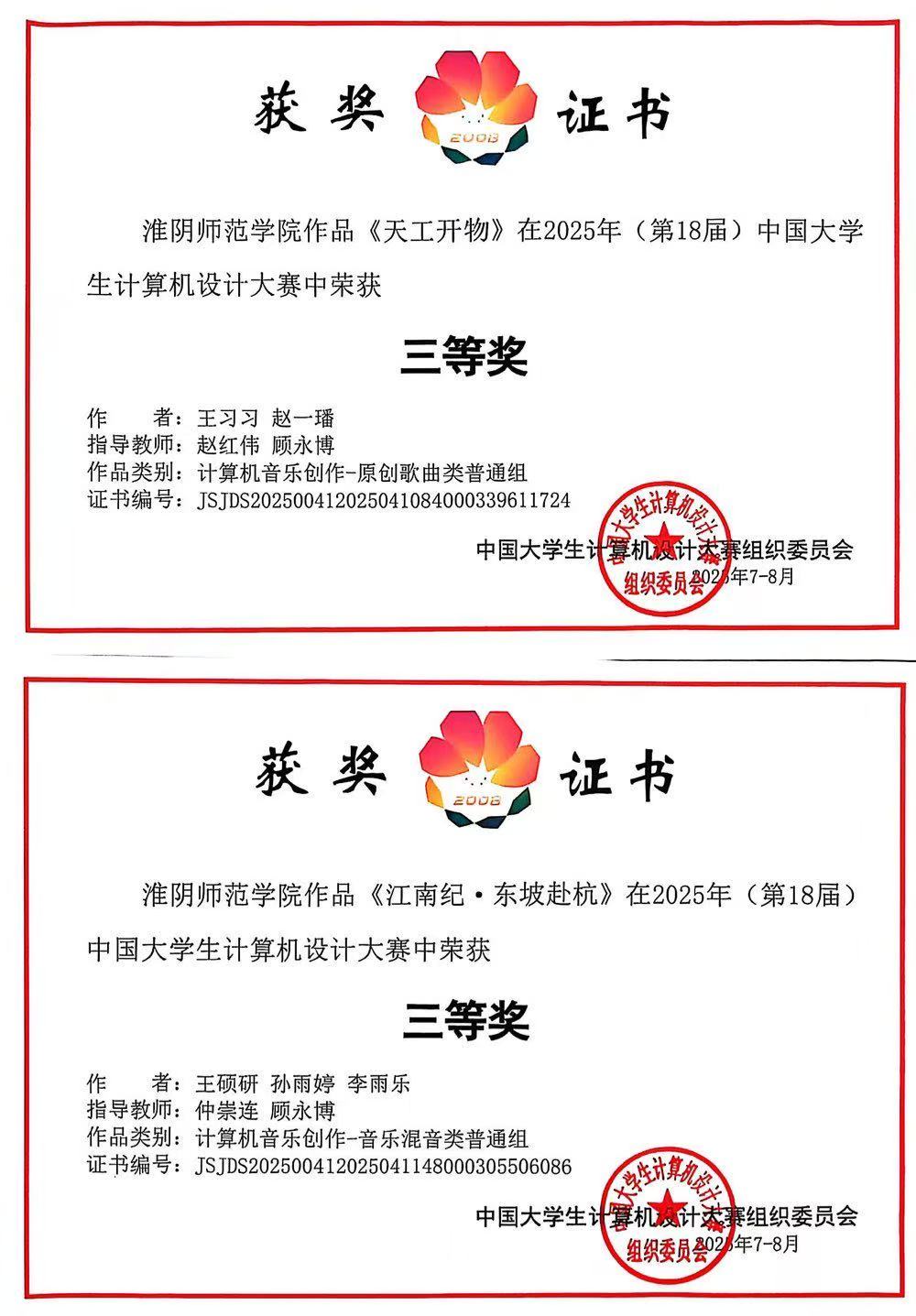 公司选送的作品《天工开物》《江南纪.东坡赴杭》在作品展示、现场答辩等环节中表现突出,赢得评委团一致认可,最终在四天的激烈角逐中斩获国家级三等奖。此次获奖不仅是对公司学子创新能力与实践水平的认可,更充分彰显了必一运动在计算机音乐创作人才培养工作中取得的显著成果,为公司深化专业内涵建设、推进产学研融合及微专业课程探索注入了新动力。