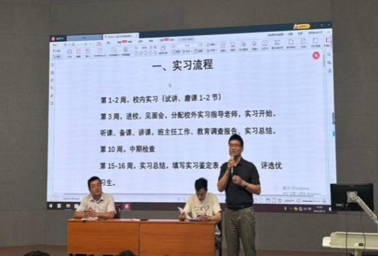 动员会上,严主任首先详细梳理了实习流程,包括为期16周的实习安排和核心要求,重点强调了实习手册的规范填写与注意事项。随后,王念主任宣读了实习纪律与成绩评定标准,从教学工作、班主任职责到教育调查报告,明确量化要求与考核维度。马骁书记介绍了实习指导教师团队的构成与职责,为实习质量筑牢根基。