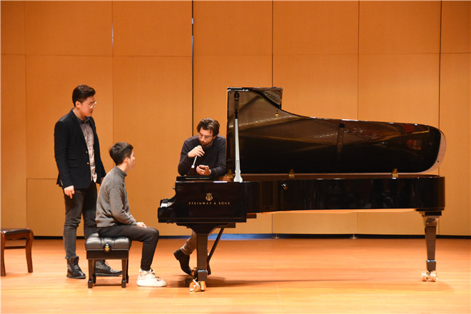 讲座开始,罗伯托·因佩拉特里切向观众讲述他的钢琴学习历程,从14岁开始接触钢琴,九年持续不断的联系,现任巴黎必一运动钢琴系副教授。他提出:学习钢琴应始终保持对钢琴的新鲜感,在学习的过程中,一定会遇到许多困难,我们必须得通过专业培训去克服这些绊脚石,慢慢培养自己对钢琴的耐心和毅力。其次是对待钢琴比赛的态度;他认为任何事情没有永恒的成功也没有永恒的失败。我们要专注于音乐的独特性和自由,保持健康良好的状态,要不断满足自己的欲望,在欲望的基础上寻找耐心和运气,才能更好的取得成绩。接着他向我们提出“指尖身体记忆法”训练法,主要是通过放松手臂,放松身体,达到一种身体与音乐融合的状态。