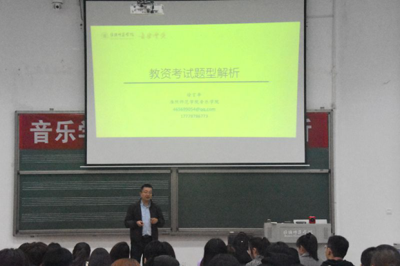 讲座从选择题型、音乐创编题、音乐分析题、教学设计、案例分析、课例点评六个方面逐步开展,并围绕着教资考试题型提出了多个考试重难点题型,并具体举例分析,剖析了诸多难点。徐老师凭借他多年来过硬的专业知识和丰富的教学教育经验给同学们分享了许多解题方法和技巧。同学们聚精会神,均感到受益匪浅,收获颇多。