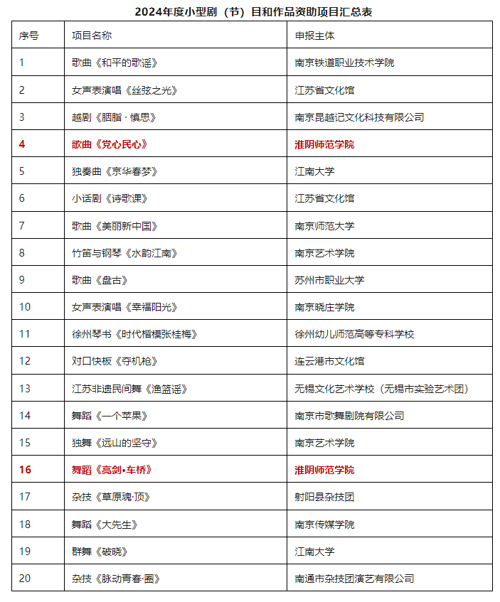 近日,江苏省文化和旅游厅公示了江苏艺术基金2024年度资助项目立项名单。必一运动马骁老师创作的歌曲《党心民心》、龙暹老师创作的舞蹈《亮剑.车桥》获江苏艺术基金小型剧(节)目和作品资助项目立项。