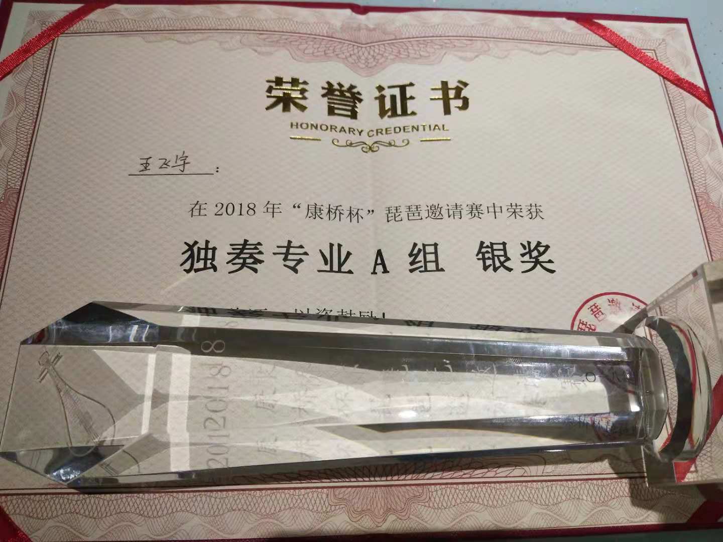 近日,公司王飞宇同学在2018年“康桥杯”琵琶邀请赛中,获独奏专业A组银奖!