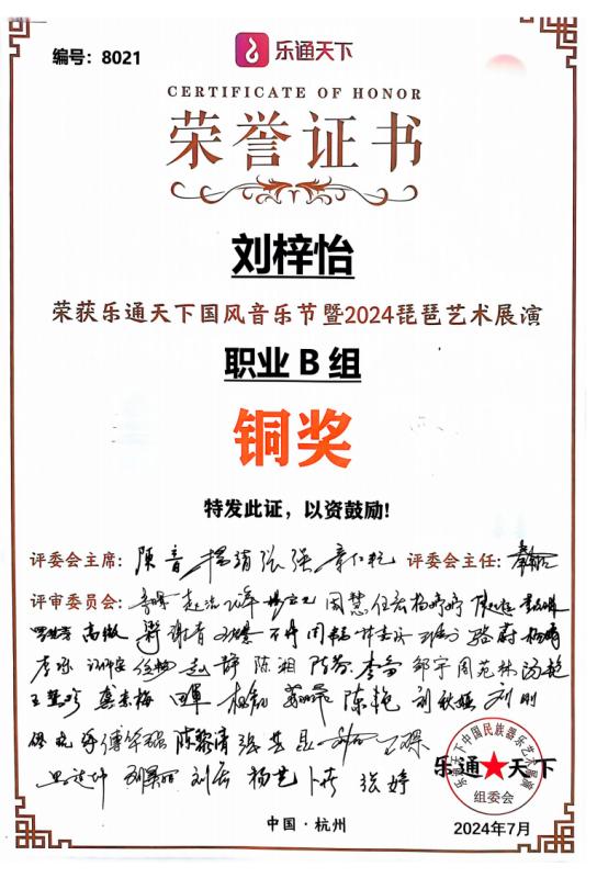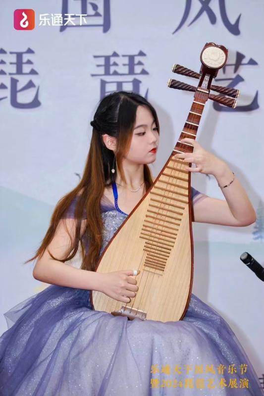乐通天下国⻛音乐节暨2024 琵琶艺术展演由乐通天下中国器乐民族乐艺展演组委会主办,十六省琵琶学会、琵琶专业委员会协办。本次大赛于2024年7月在杭州举办,活动秉承“弘扬中华优秀传统音乐文化,传承发展中国琵琶艺术”宗旨,超百位中国琵琶名家共同参与评选。刘梓怡同学在比赛中一路过关斩将,凭借优异的表现取得铜奖。