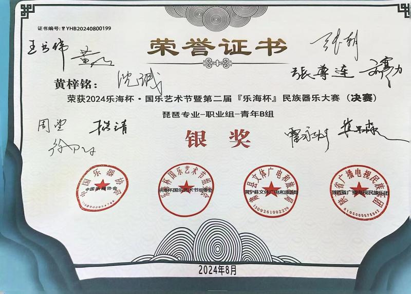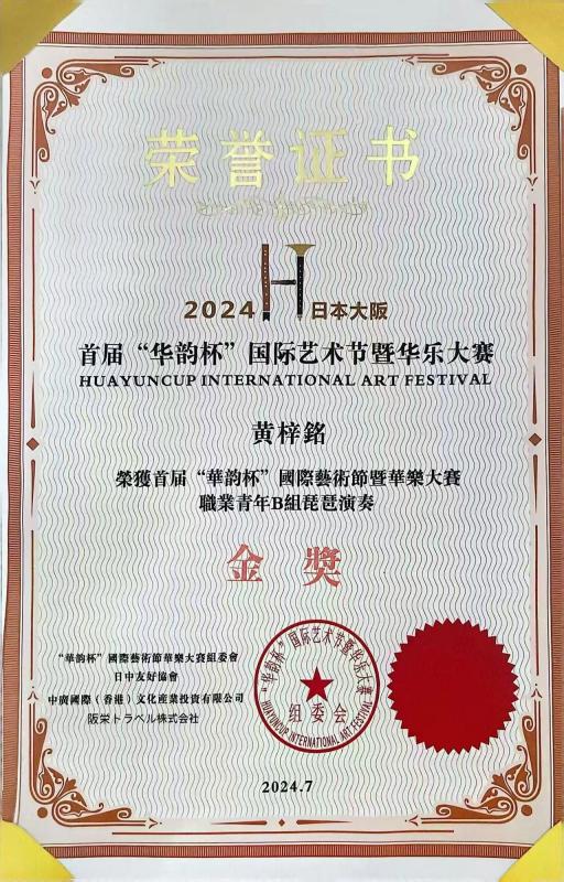 “华韵杯”国际艺术节是一项具有国际性、艺术性、权威性的文化艺术盛典,由中日友好协会举办,本届艺术节于2024年7月在日本大阪举行。“乐海杯”国乐艺术节民族器乐大赛以弘扬中华优秀传统文化为宗旨的专业器乐比赛,由中国乐器协会主办,本次大赛有来自中国歌剧舞剧院民族乐团和各省民族乐团的选手参加比赛,于2024年8月在河北沧州举办。在这两项大赛中,黄梓铭同学不畏强手,凭借扎实的专业功底和独特的艺术表现力斩获金奖和银奖。