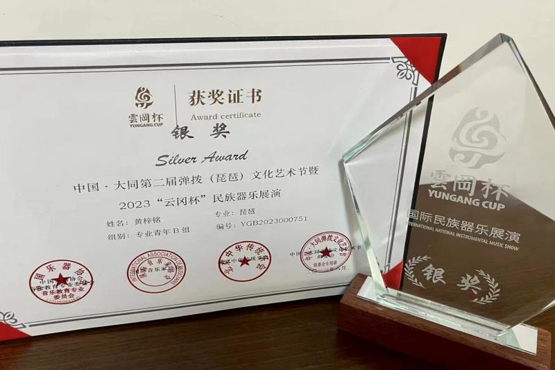 近日,中国·大同第二届弹拨(琵琶)文化艺术节暨2023“云冈杯”民族器乐展演落下帷幕,必一运动2021级音乐学专业员工黄梓铭荣获职业青年B组独奏银奖。