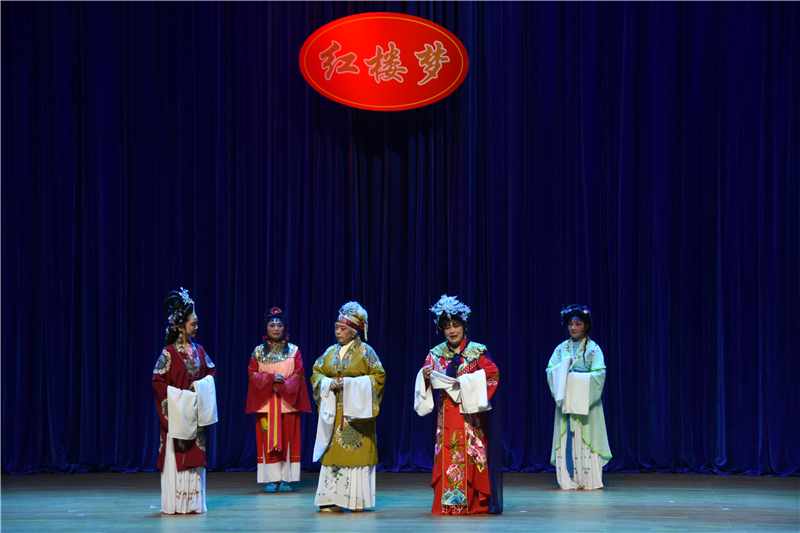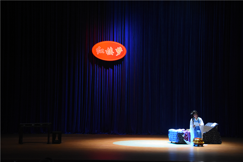 伴随着一段美妙的越曲旋律,汇演拉开帷幕。第一场是由《红楼梦》中主要人物共同演绎的经典回合——《元妃省亲》。深沉隽永,缠绵柔和的腔调令人联想到原著中元妃最终的悲苦命运。第二场是经典画面《读西厢》,《西厢记》是古典戏剧名著,表达了“愿天下有情人都成为眷属”的美好愿望。这也是宝玉对黛玉的真情告白。“黛玉葬花”这一片段的唱腔细腻婉转,深情意浓,惜花亦如惜己,体现了黛玉孤傲的本性 。《傻丫头泄密》这一回合的唱腔,柔和甜润,韵味醇厚,也暗示了林黛玉含恨而死的结局。那哀怨凄婉《黛玉焚稿》和悲痛欲绝《宝玉哭灵》更加使人印象深刻,让人不禁联想到《红楼梦》中所批判的封建主义的残酷,以及宝玉、黛玉两人对陈旧社会的厌弃。