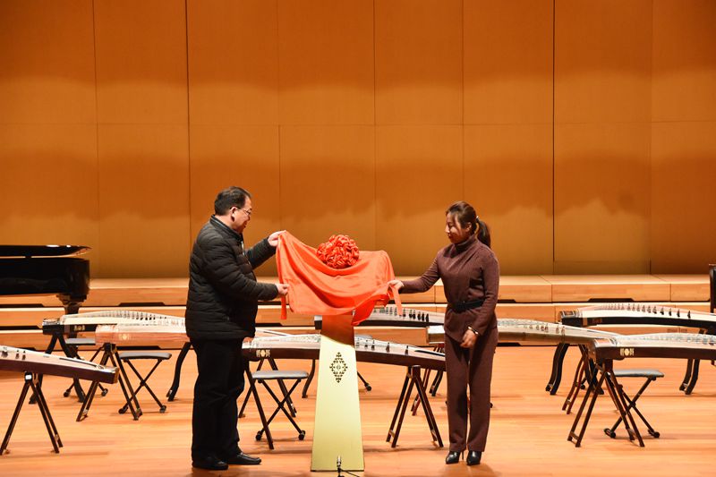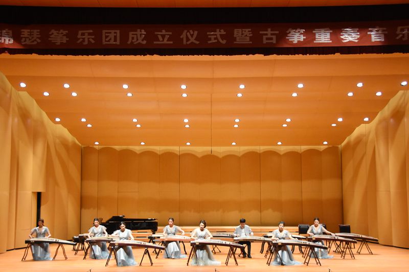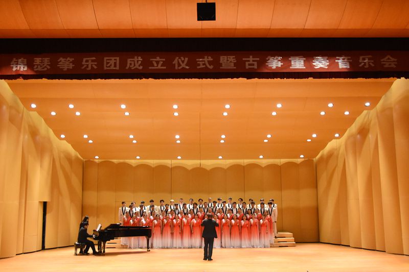 仪式开始,仲崇连为筝乐团成立仪式致辞,简要介绍筝乐团的情况,并提出对筝乐团的期许与希望。致辞结束,郑健、章莉共同为锦瑟筝乐团揭牌。揭牌仪式后,古筝重奏音乐会拉开帷幕。音乐会以一首悠扬的《天山之歌》开场,琴声婉转流畅,像那小溪泉水叮咚,像那山谷的幽兰,又好像一位英雄豪杰;接着是一首《森林狂想曲》,台下热烈的掌声像波涛般奔涌不息,弹奏者缓缓划动着细细的琴弦,优美的音符一个个轻快的跳出,呈现着一曲古典之韵;接着一首《菊花台》又把人带进聒美的心境,听起来或缠绵悲切,或泉水叮咚,或如走马摇铃,那筝音有如桥下潺潺的流水,有如看薛涛的浣花小笺,又恰似那一树紫丁香的缤纷;最后,音乐会以一首铿锵有力,荡气回肠的《盛世国乐》进入尾声,婉转低沉的琴音,如靡靡之音,回响天际,静听犹在耳畔。台上演奏者们的精彩演绎,为现场的观众们奉献了一场精彩绝伦的视听盛宴。音乐会也在一片热烈的掌声中画上完美的句号。